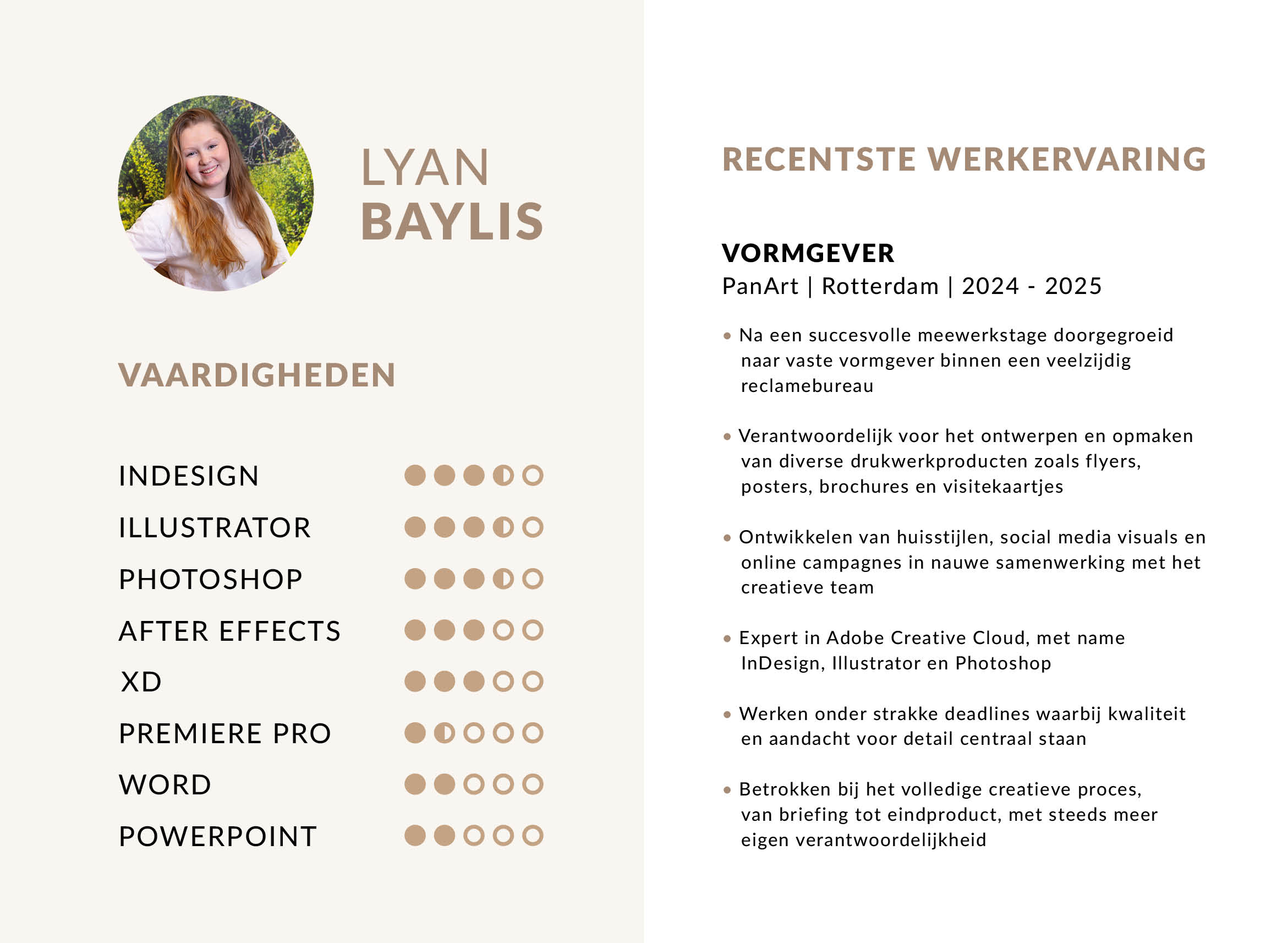 Ik ben Lyan Baylis, een grafisch vormgever uit Rotterdam. Ik ben afgestudeerd aan het Grafisch Lyceum Rotterdam, met een specialisatie in corporate design. Tijdens mijn opleiding liep ik stage bij PanArt Reclamebureau in Rhoon, waar ik aan uiteenlopende opdrachten mocht meewerken. De stage verliep zo goed dat ik er daarna een jaar in dienst ben gebleven.