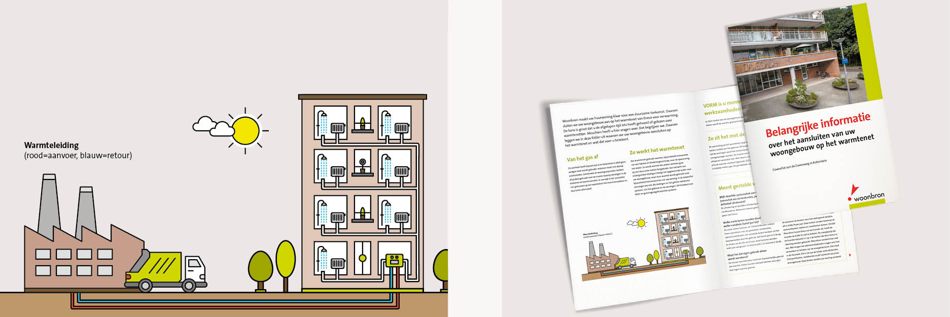 Woonbron staat voor duurzaam wonen en betaalbaarheid. In lijn met de landelijke klimaatdoelen en de afspraken die gemeenten en woningcorporaties hierover hebben gemaakt, worden steeds meer woningen losgekoppeld van aardgas. Ook de Dawesflat aan de Dawesweg in Rotterdam wordt voorbereid op een toekomst zonder gas. Om bewoners goed te informeren over deze overgang, ontwikkelden we een toegankelijke en overzichtelijke informatiebrochure. Deze folder moest helder uitleggen wat stadswarmte inhoudt, wat er in de woning gebeurt, wat de kosten zijn én de meest gestelde vragen beantwoorden.